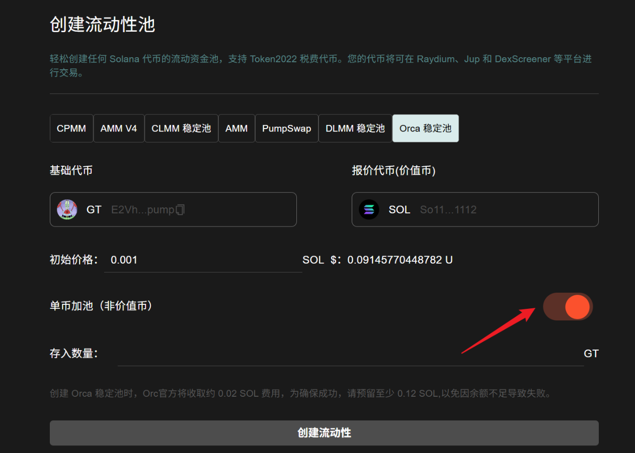 单币加池参数填写 单币加池:打开单币加池开关。 初始价格:设置池子的初始价格。 存入数量:设置存入基础代币的数量,不需要存入价值币(比如 SOL)。 钱包预留余额估算: *钱包余额需要大于(Orca 官方收取 0.02 SOL + 服务费用 0.08 SOL,预留 0.01 SOL)的总和。 *温馨提示:单币加池代币是无法卖出的,只能买入。如果你希望代币可以卖出,需要往池子里加入价值币才行,通过我们的市值机器人买入一笔就行。