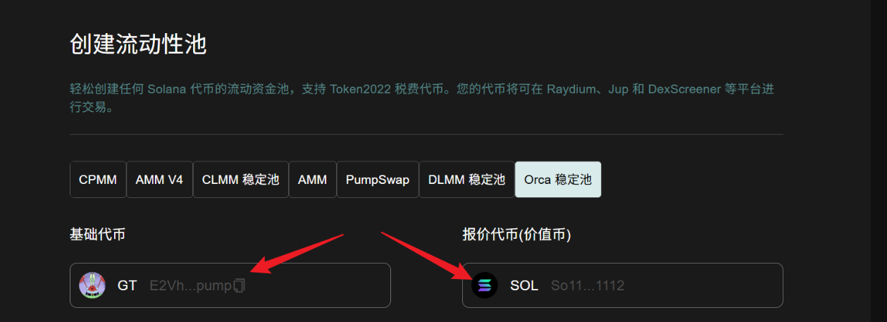 创建流动性池: https://sol.gtokentool.com/zh-CN/liquidityManagement/CreatePool