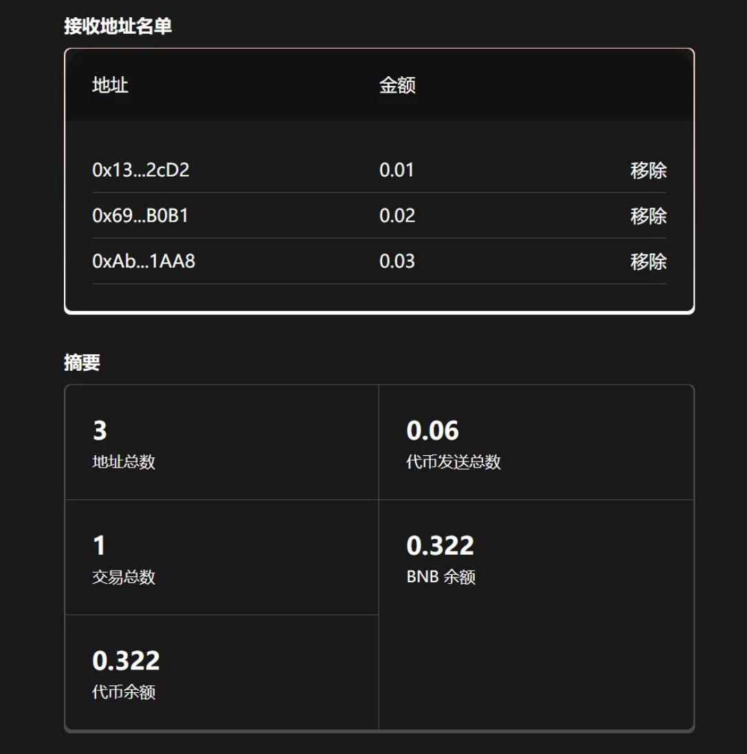 代币空投(Airdrop) :这是最经典的应用场景。项目方通过批量转账,一次性将代币分发给几百到几万个社区成员,用于推广或激励。 社区分红与奖励:按持币量向持有者发放分红,或者给活动参与者批量发放奖励代币。 工资/薪酬发放:一些 Web3 项目使用代币支付团队成员薪酬,批量转账比每月逐个转账高效得多。 资金归集与管理:将分散在多个地址的代币集中到一个地址,或者把代币分配到多个地址分散风险。 NFT 分发:向多个持有者批量发送 NFT 资产。 退款处理:批量将代币退还给用户。