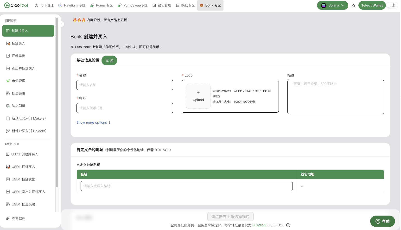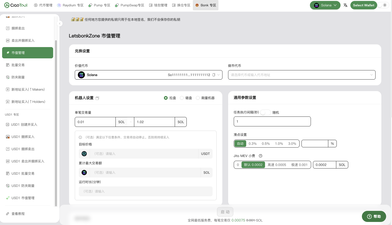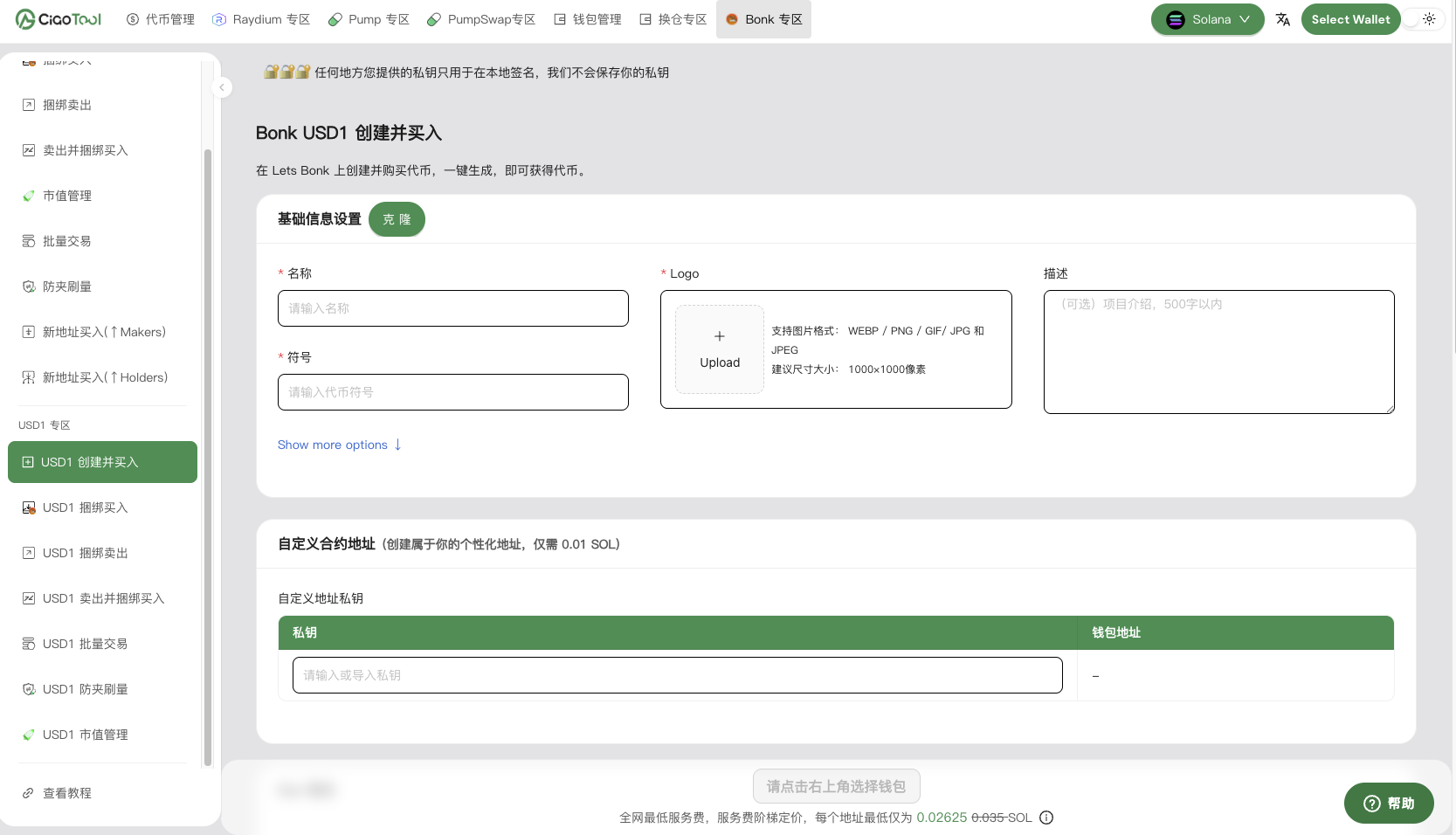 CiaoTool 的定位正在超越传统意义的发币工具。在Bonk 专区和Pump 专区中,覆盖了发币后的关键操作环节。界面清晰、逻辑直观,允许你根据不同市场节奏自由设定策略。