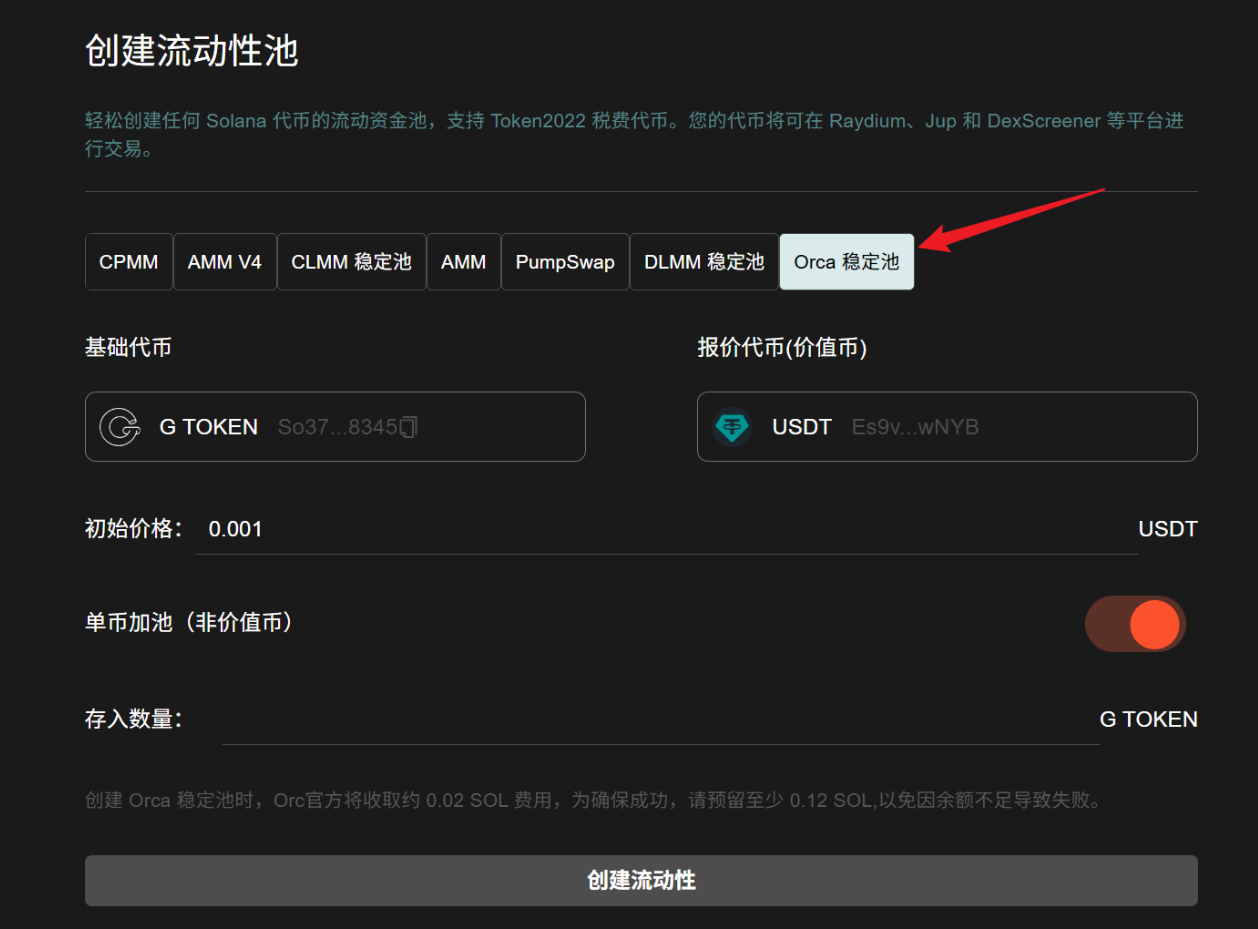 单币加池参数填写 单币加池:打开单币加池开关。 初始价格:设置池子的初始价格。 存入数量:设置存入基础代币的数量,不需要存入价值币(比如 SOL)。 钱包预留余额估算: *钱包余额需要大于(Orca 官方收取 0.02 SOL + 服务费用 0.08 SOL,预留 0.01 SOL)的总和。 *温馨提示:单币加池代币是无法卖出的,只能买入。如果你希望代币可以卖出,需要往池子里加入价值币才行,通过我们的市值机器人买入一笔就行。