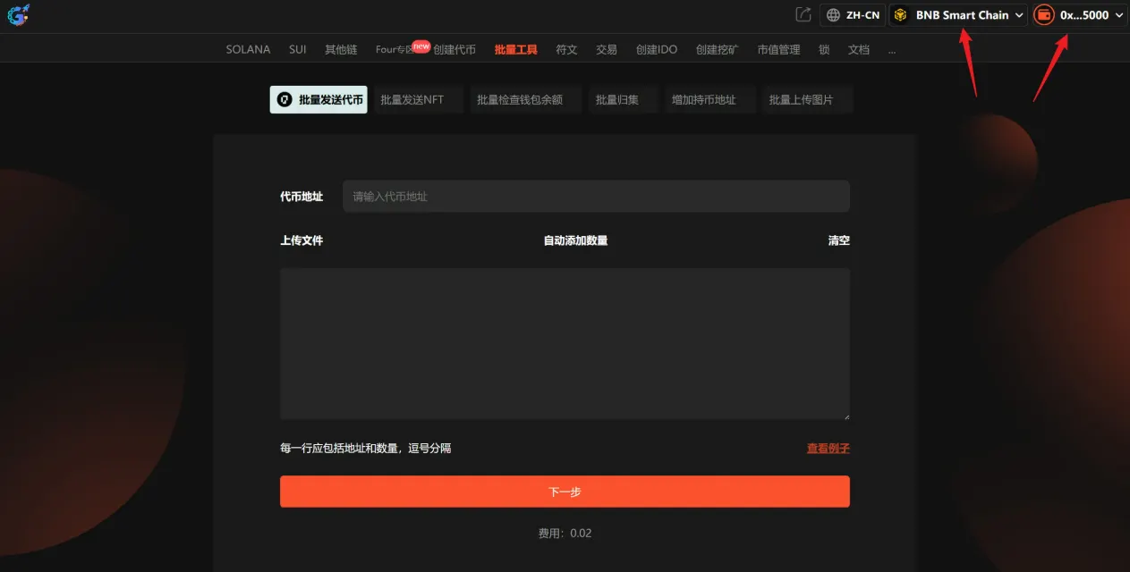 进入 GTokenTool 代币批量转账页面:https://gtokentool.com/sendertoken,点击右上角,连接小狐狸钱包,并切换到主网。