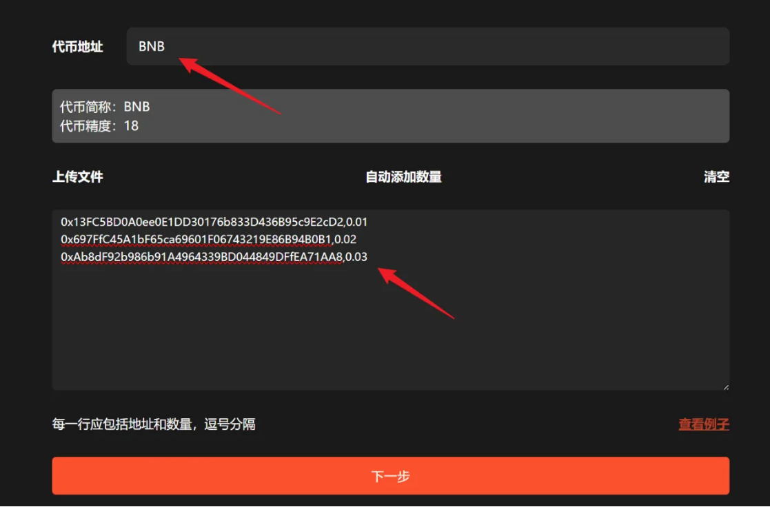 假设我们给三个地址发送不同数量的代币,输入如下: